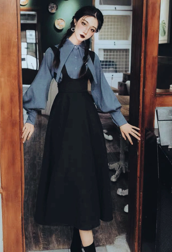 2-teiliges Dark Witchy Academia-Kleiderset mit Trägerkleid in Anthrazit und einer Bluse mit langen Puffärmeln und spitzem Kragen in kaltem Blau.