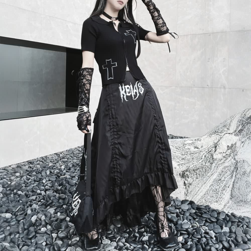 Gönnen Sie sich luxuriöse Mode mit unserem schwarzen Gothic High Low Stufen-Maxirock. Dieser stylische Rock besticht durch seine hohe Taille und das Stufendesign für einen markanten High-Low-Effekt. Knöchellang und mit eleganten Rüschendetails strahlt dieser A-Linien-Rock Eleganz aus. In zeitlosem Schwarz ist er ein Must-have für alle Modebegeisterten, die ein schickes Statement-Piece suchen.