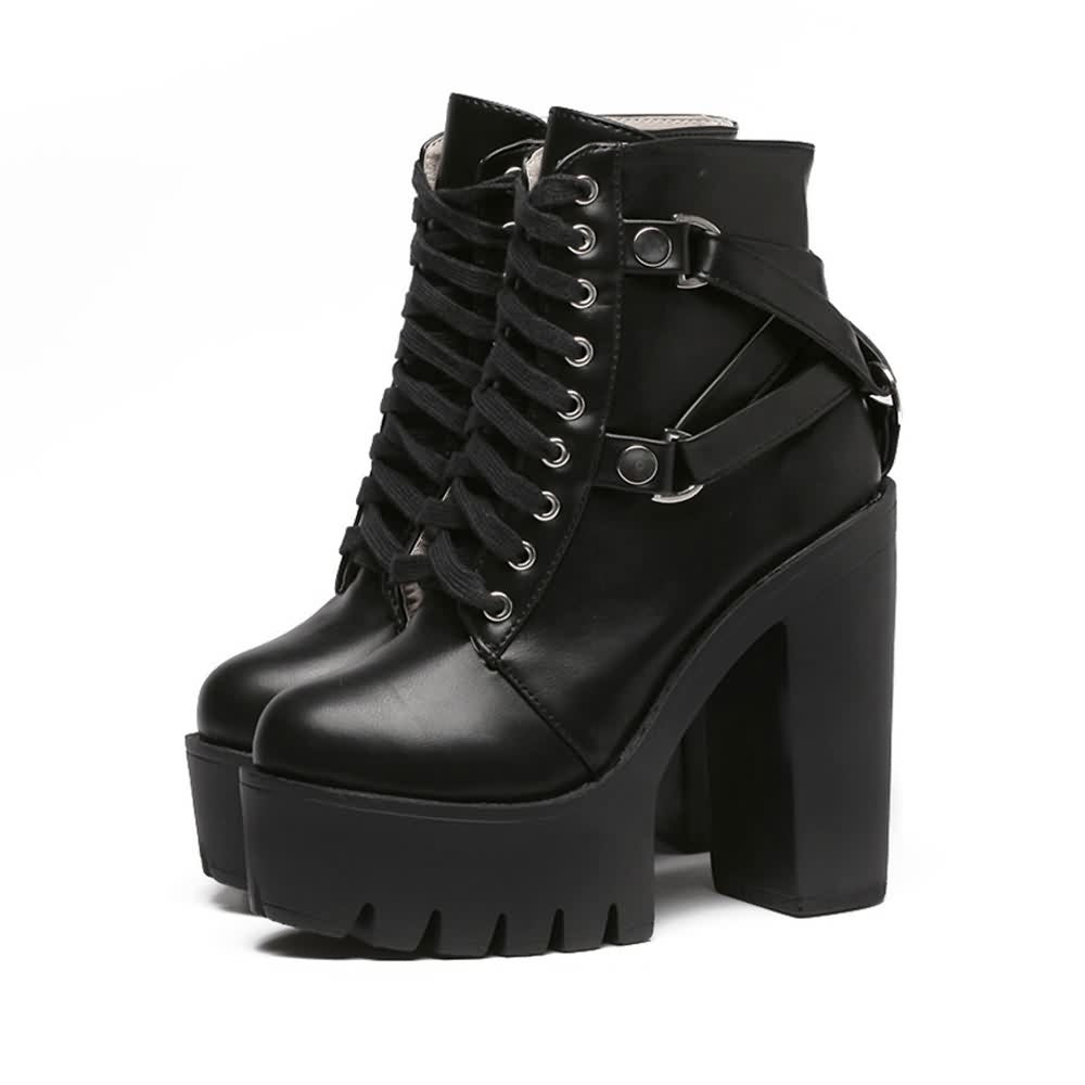Veredeln Sie Ihren kantigen Stil mit unseren schwarzen Gothic-Punk-Plateau-Stiefeletten mit Blockabsatz. Diese Stiefel aus veganem Leder mit Plateausohle und Blockabsatz sorgen für Komfort und einen markanten Stil. Die Schnürung vorne und die Knöchelriemen verleihen einen robusten Touch und machen sie perfekt für Liebhaber alternativer Gothic- und Punk-Mode. Werten Sie Ihre Garderobe mit diesen Statement-Stiefeln auf.