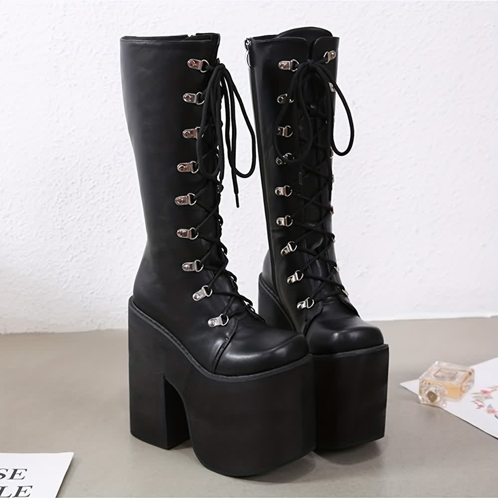Veredeln Sie Ihren Stil mit unseren schwarzen Gothic Punk Schnürstiefeln mit klobiger Plateausohle und halbhohem Absatz. Diese Stiefel aus luxuriösem veganem Leder haben eine klobige Plateausohle und einen Blockabsatz. Sie bieten Komfort und zusätzliche Höhe. Die verstellbare Schnürung vorne und die wadenlange Länge sorgen für einen einzigartigen, kantigen Look. Perfekt für Fans von Gothic, Punk, Rock oder alternativer Mode. Werten Sie Ihre Garderobe mit diesem auffälligen Statement-Stück auf.