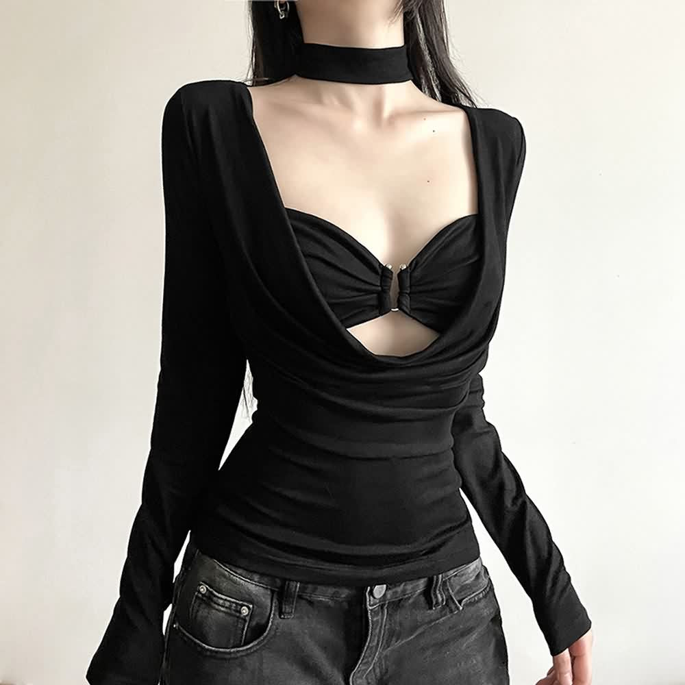 Gönnen Sie sich Eleganz mit unserem schwarzen Langarm-Top mit U-Ausschnitt. Hergestellt aus einer luxuriösen Mischung aus Polyester und Elasthan. Dieses schmal geschnittene Top mit schickem U-Ausschnitt und langen Ärmeln sorgt für einen raffinierten Look. Komplett mit passendem BH-Top und Choker. Dieses komplett schwarze Ensemble verleiht Ihrem Stil raffiniertes Flair. Perfekt für jeden Anlass, bei dem Luxus auf moderne Mode trifft.