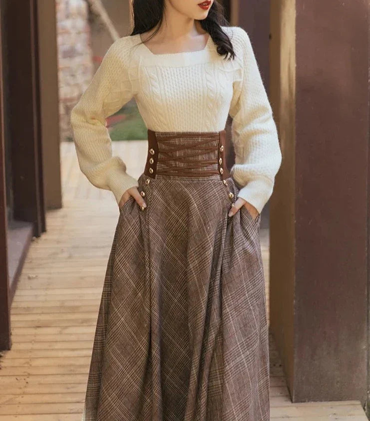 Gönnen Sie sich den zeitlosen und eleganten Stil des zweiteiligen Sets „Calling The Fog Dark Academia“. Es besteht aus einem geschnürten Rock mit hoher Taille aus weicher Wolle und einem weichen Strickpullover. Dieses Set hält Sie in den kälteren Monaten warm und wertet Ihren Look mit seinem klassischen Karomuster auf. Perfekt zum Tagträumen in der gemütlichen Umarmung des Winters.