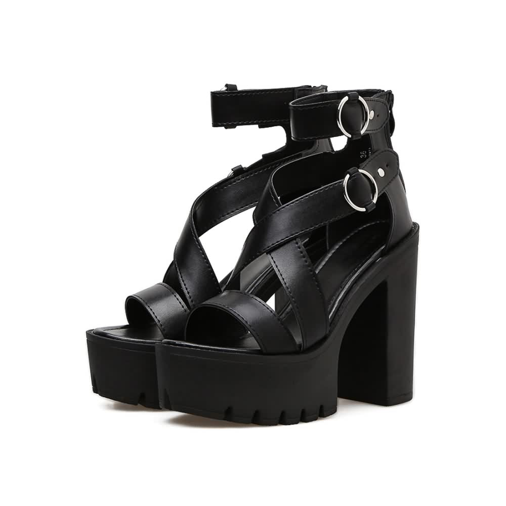 Erleben Sie Luxus mit unseren Gothic-Plateau-Sandalen mit Knöchelriemen und hohem Absatz. Hergestellt aus veganem Leder. Diese Sandalen verfügen über einen Reißverschluss auf der Rückseite, eine Plateausohle und verstellbare Schnallenverschlüsse am Knöchel. Veredeln Sie Ihren Stil mit der schicken schwarzen Farbe und den robusten Blockabsätzen. Passend für alle Anlässe.