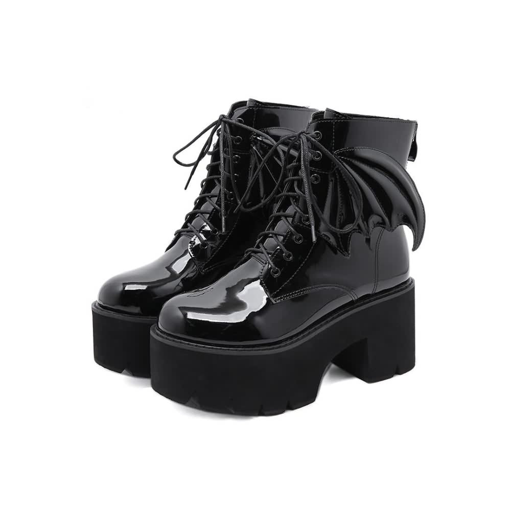 Enthüllen Sie gewagte und geheimnisvolle Mode mit unseren Gothic Bat Lace Up Plateau-Stiefeln. Diese Stiefel bestechen durch Fledermausflügel-Verzierungen, einen praktischen Reißverschluss auf der Rückseite und ein Obermaterial aus glattem Lackleder. Sie vereinen Stil mit Funktionalität. Die Gummilaufsohle sorgt für Stabilität, während die kräftige schwarze Farbe für einen kantigen Look sorgt. Schreiten Sie selbstbewusst und mit Flair in die Nacht mit diesen Statement-Stiefeln.