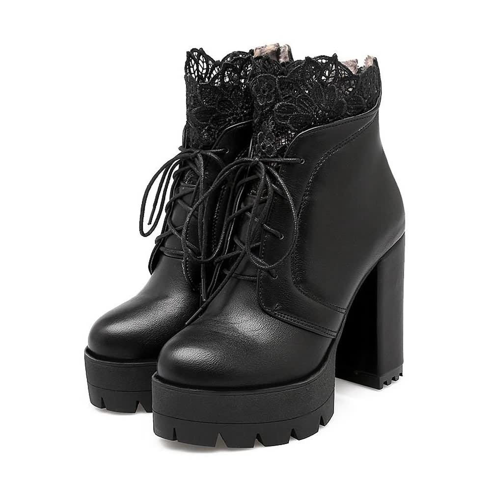 Veredeln Sie Ihren Stil mit unseren Gothic-Plateaustiefeln mit Spitze. Die aufwendige florale Spitzenstickerei verleiht ihm einen eleganten Touch und der praktische Reißverschluss an der Rückseite sorgt für zusätzlichen Komfort. Hergestellt aus hochwertigem PU-Leder mit einer strapazierfähigen Gummisohle. Diese Stiefel vereinen Stil und Langlebigkeit. Erhältlich in zeitlosem Schwarz und Weiß. Diese stylischen Schnürstiefel sind ein Must-have für modebewusste Damen.