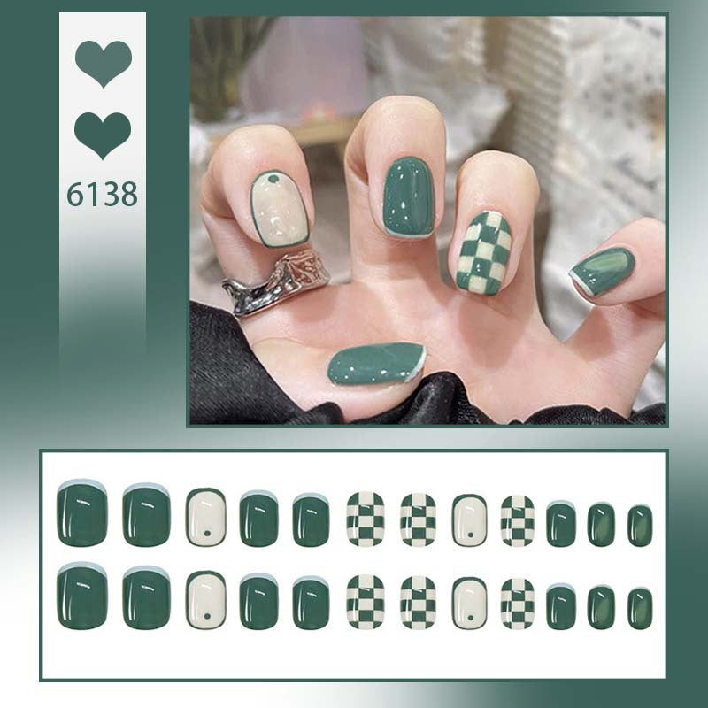 • Tragbare Nägel mit grünem und weißem Schachbrettmuster, fertige Maniküre, 4 Stück