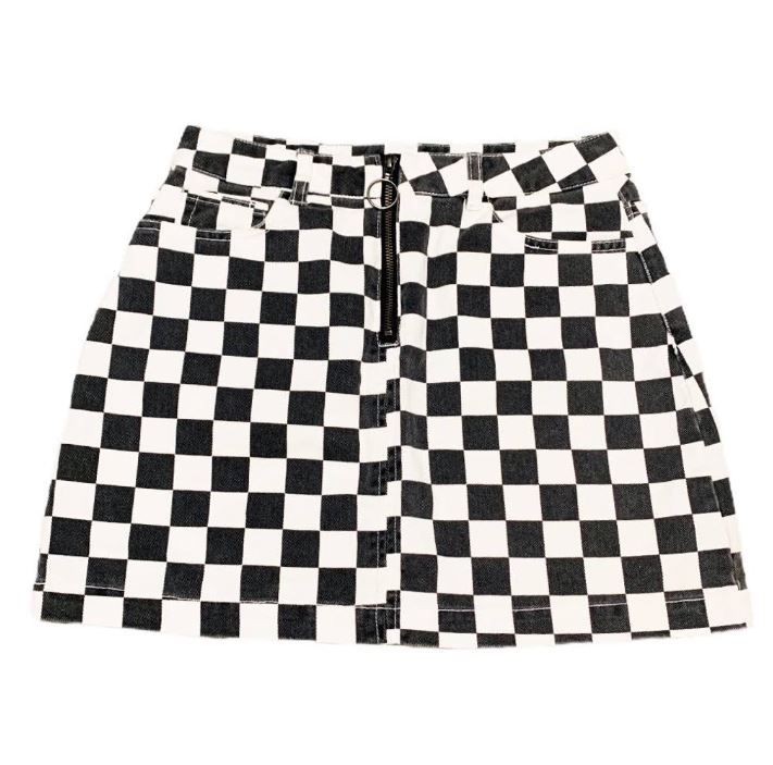 Grunge Schwarz Weiß Kariertes Gitter Front Reißverschluss Rock