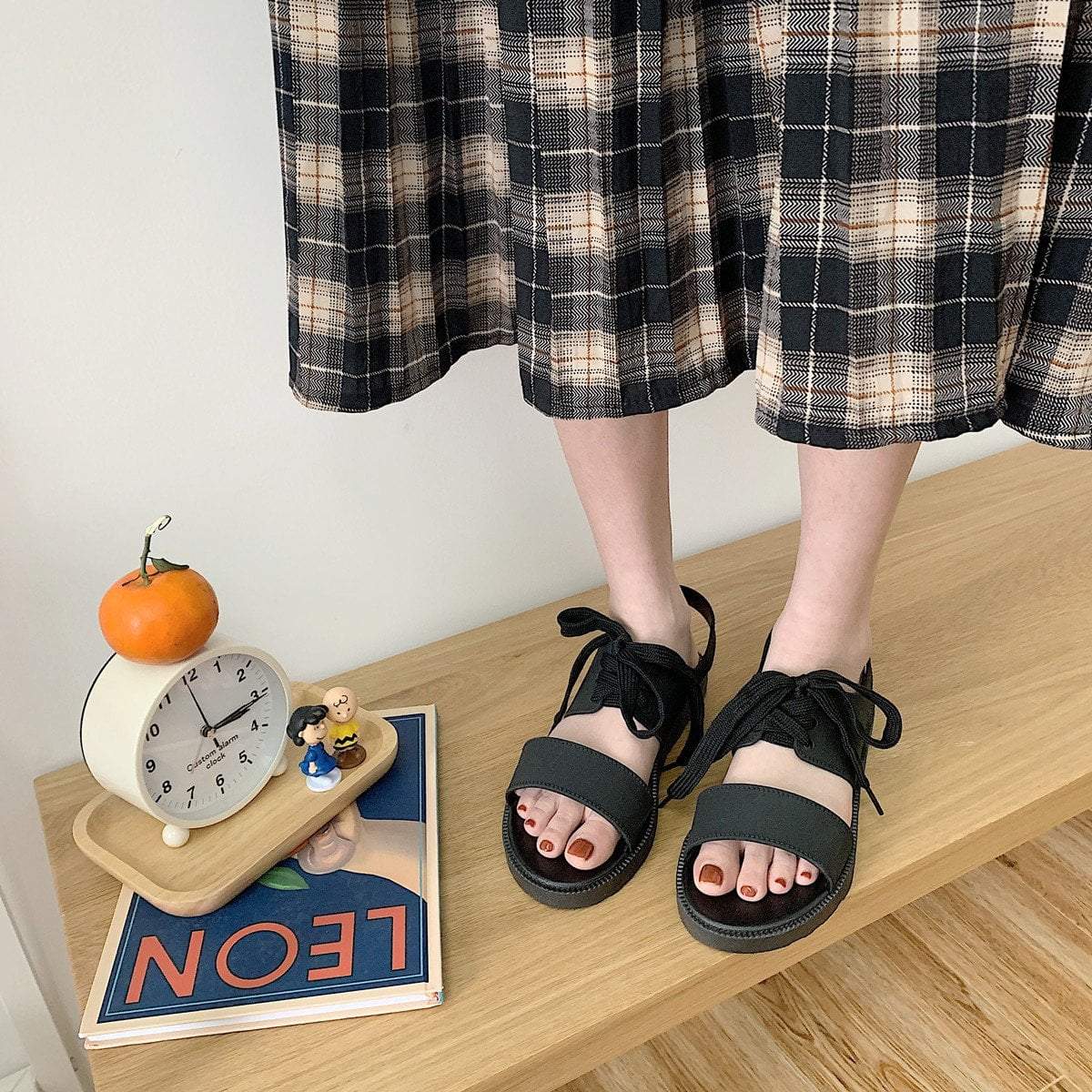 Flache schwarze ästhetische Sommersandalen zum Schnüren