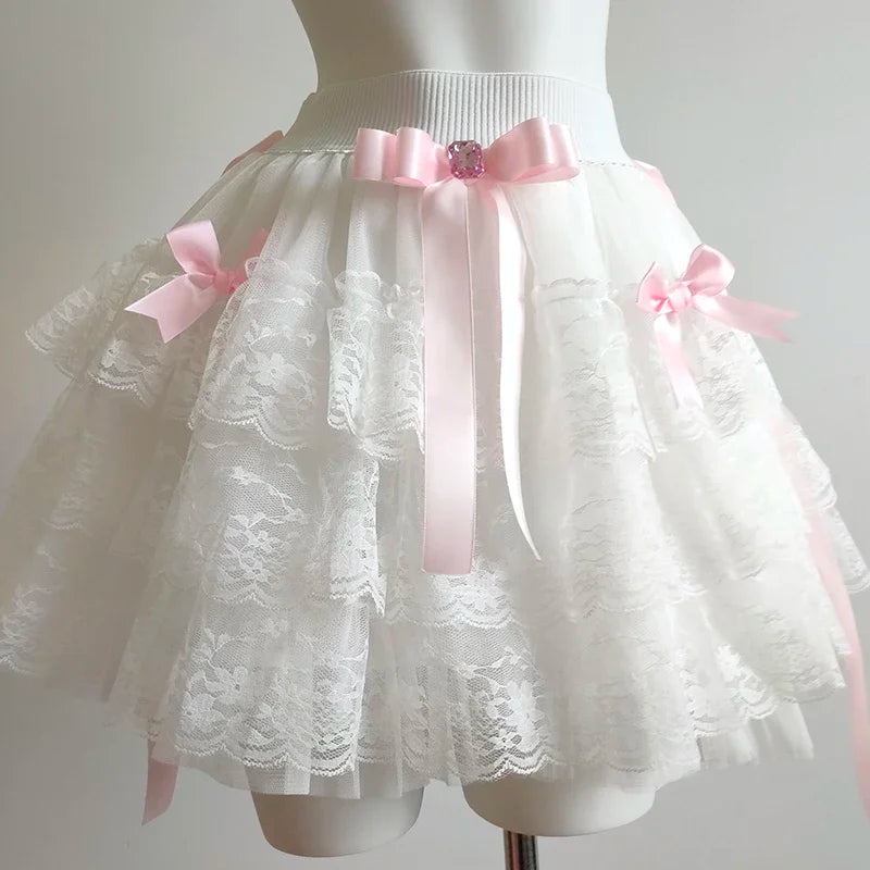 Dieser mehrlagige Minirock aus Tüllspitze mit Schleife hat einen elastischen Bund, integrierte Shorts, zarte Spitzenlagen und eine bezaubernde Schleifenverzierung. Verleihen Sie Ihrer Garderobe mit diesem verspielten und verspielten Rock ein kokettes Flair!