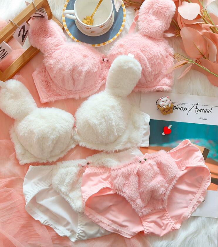 2-teiliges Soft Fuzzy Bunny Plüsch Kawaii Dessous Set mit gepolsterter Brust und Rosenschleifenverzierung