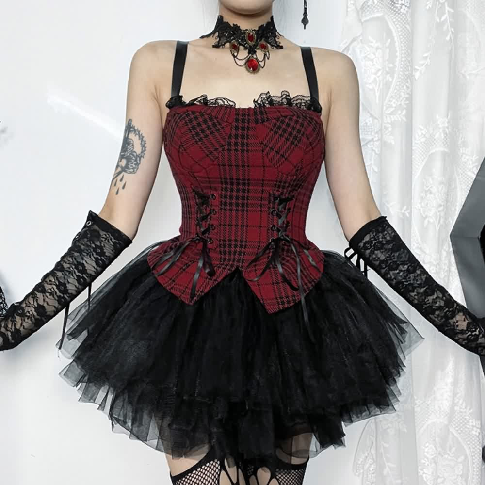 Entfesseln Sie Ihren trendigen Stil mit unserem Vintage Goth Plaid Sleeveless Top und Minirock Set. Das auffällige rot karierte Top mit schicken Schnürdetails und zarten Trägern strahlt eine raffinierte Note aus. Das ärmellose Design und der geteilte Saum sorgen für eine schlanke, elegante Silhouette. Kombiniert mit einem schwarzen Stufen-Minirock mit Netzstoffschichten verleiht dieses Set Ihrer Garderobe Tiefe und einen Hauch von Luxus.