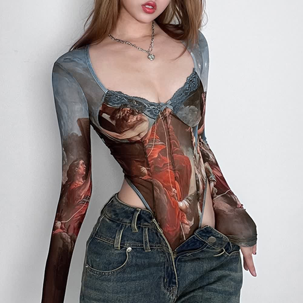 Presentamos nuestro body de malla de manga larga con estampado griego antiguo. Con un escote en V cuadrado y un intrincado estampado de inspiración renacentista, esta prenda irradia sofisticación. El ribete de encaje le da un toque lujoso, mientras que la malla ofrece una sensación ligera y elegante. Diseñado con un corte alto que estiliza tu silueta, este exclusivo body realzará cualquier armario.