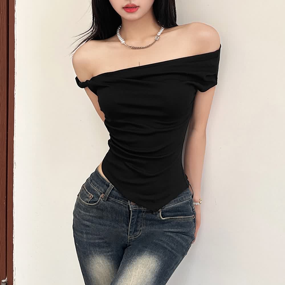 Disfruta de una elegancia natural con nuestro top asimétrico de hombros descubiertos. Con un llamativo bajo asimétrico que realza tu silueta, este diseño de hombros descubiertos irradia sofisticación. Elaborado con una lujosa mezcla de poliéster y elastano, este top corto ofrece un corte entallado para un look favorecedor y elegante.