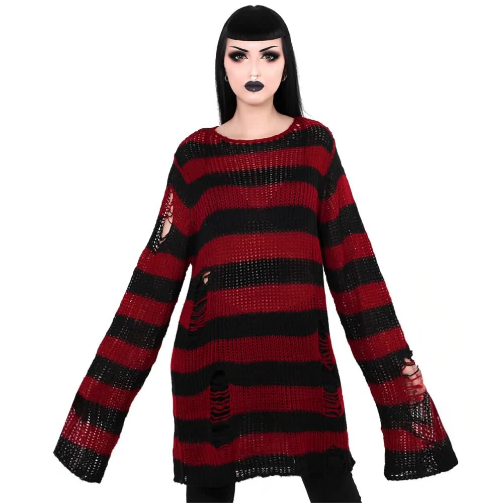 Realza tu estilo con nuestro suéter gótico de punto desgastado con rayas negras y rojas. Confeccionado en punto suave para una comodidad suprema, las rayas negras y rojas irradian sofisticación. Con mangas extralargas y una silueta alargada, este suéter es ideal para un look chic y relajado. Los detalles desgastados le aportan un encanto distintivo a esta prenda esencial de talla única.
