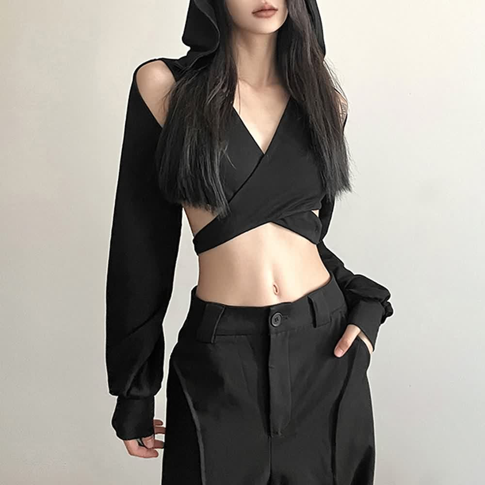 Disfruta del glamour oscuro con nuestro top corto gótico negro con capucha. Con un favorecedor diseño cruzado y hombros al descubierto, este top irradia sofisticación vanguardista. La capucha le da un toque alternativo, mientras que la mezcla de poliéster y elastano garantiza comodidad y durabilidad. Perfecto para quienes buscan una estética alternativa y audaz.