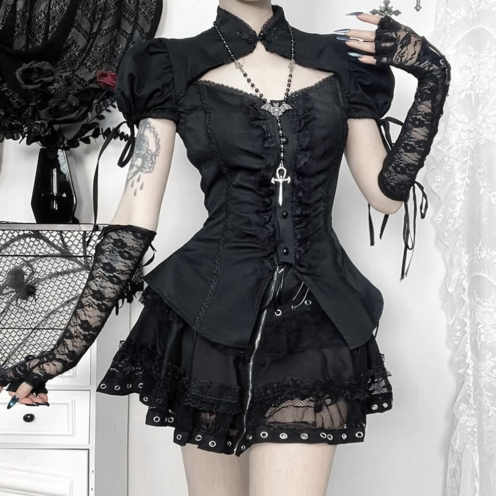 Realza tu estilo alternativo con nuestra blusa negra de lolita gótica. Con escote de ojo de cerradura y cuello alto, esta blusa ofrece un toque único y elegante. Las mangas cortas abullonadas y la abertura frontal crean una silueta favorecedora. El color negro y el detalle de encaje irradian sofisticación. Realza tu estilo con esta exclusiva pieza de inspiración gótica.