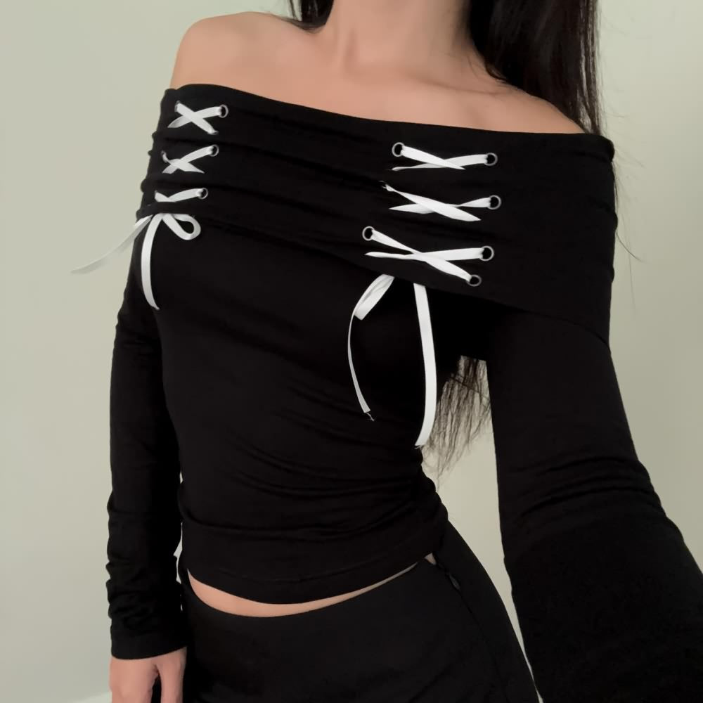 Realza tu estilo sin esfuerzo con nuestro top gótico negro de manga larga con hombros descubiertos. El detalle de cordones y el escote doblado le dan un toque moderno, mientras que el estilo bardot irradia sofisticación. Confeccionado en una cómoda y elegante mezcla de poliéster y elastano, este top es imprescindible en tu armario.