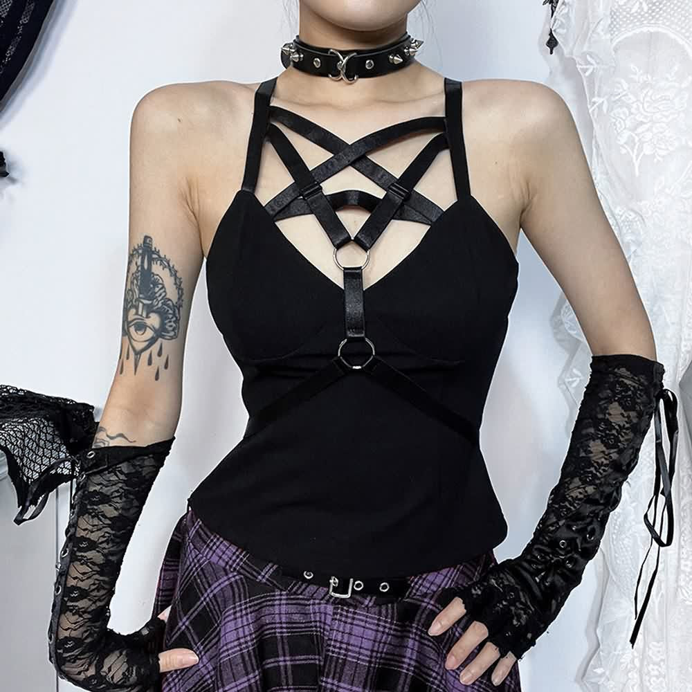Explora el glamour oscuro con nuestro top corto gótico negro con pentagrama y arnés. Libera tu lado rebelde con el arnés con pentagrama. Complementado con un top de tirantes y un elegante corte corto para un toque de sofisticación. Sin mangas y en un negro impactante, este top es imprescindible para las amantes de la moda vanguardista que buscan un estilo único.