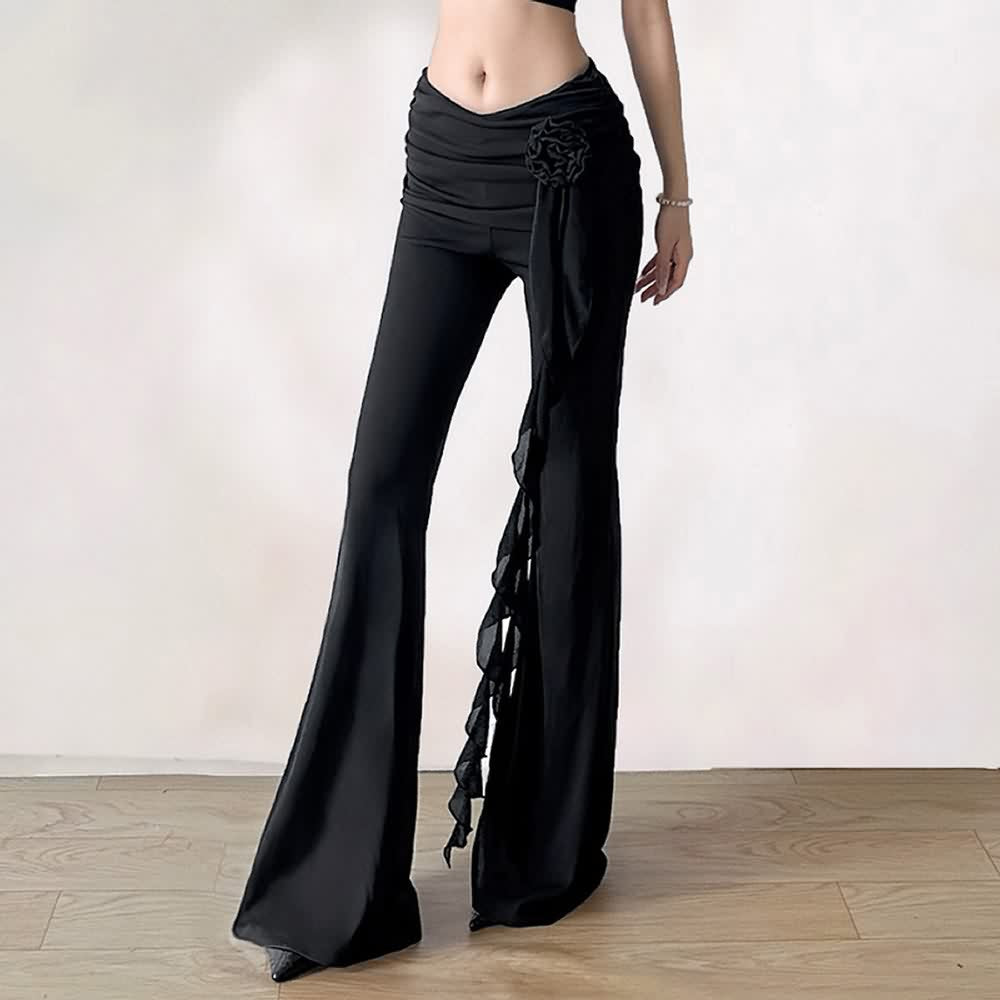 Presentamos nuestros pantalones acampanados negros góticos con cintura alta y fruncido, diseñados para quienes buscan una estética vanguardista y alternativa. Estos pantalones presentan un exclusivo adorno floral en el lateral para mayor sofisticación. Los detalles fruncidos y la silueta acampanada crean un ajuste favorecedor, mientras que la cintura alta garantiza comodidad y estilo. Luce un estilo audaz y moderno con estos llamativos pantalones negros.