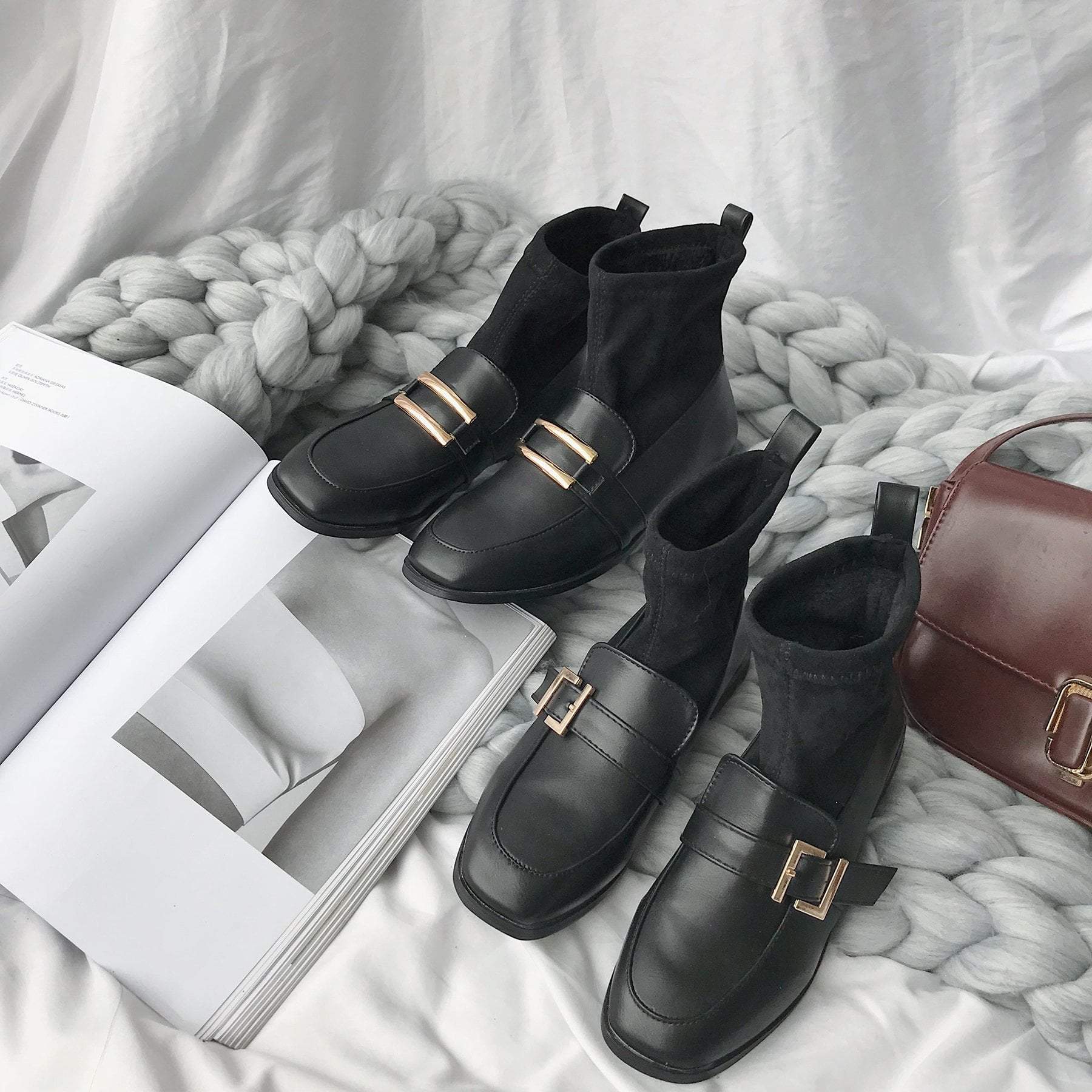 Botas cálidas de terciopelo con hebilla cuadrada negra