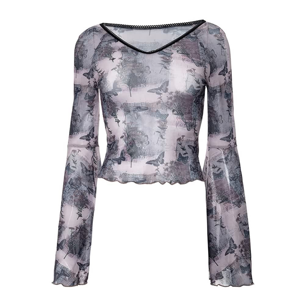 Mejora tu armario con nuestro top corto de manga larga acampanada con mariposas. Este elegante top luce un elegante dobladillo ondulado, un profundo escote en V y un toque gótico. El exquisito diseño de mariposas le da un toque romántico a esta exclusiva prenda. Realza tu estilo con este top corto esencial.