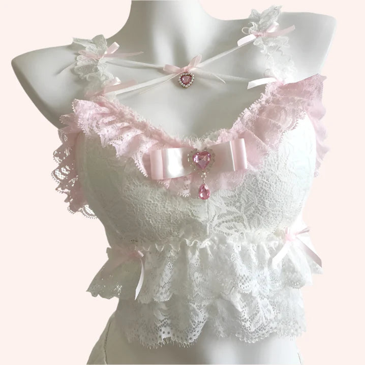 El top de encaje Corazón Mágico de Cristal presenta volantes alegres con lazos, un lazo rosa y dijes de cristal en forma de corazón rosa. ¡Este top de encaje combina a la perfección un estilo coqueto y dulce! También está disponible un conjunto de dos piezas con pantalones bombachos a juego.