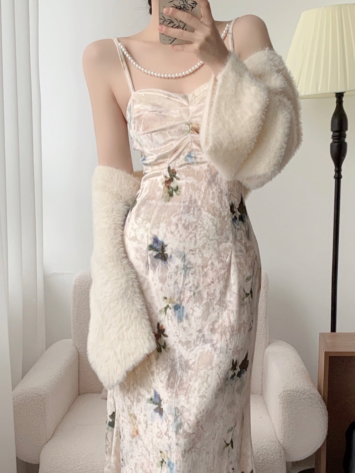 Consiéntete con un glamour delicado con nuestro conjunto de dos piezas de vestido y bolero de terciopelo y perlas. El suave terciopelo arrugado, los femeninos detalles de perlas en el escote y el suave bolero elevan este conjunto a una declaración de sofisticación. Perfecto para cualquier ocasión especial. Este conjunto de vestido y bolero irradia elegancia y glamour refinado.