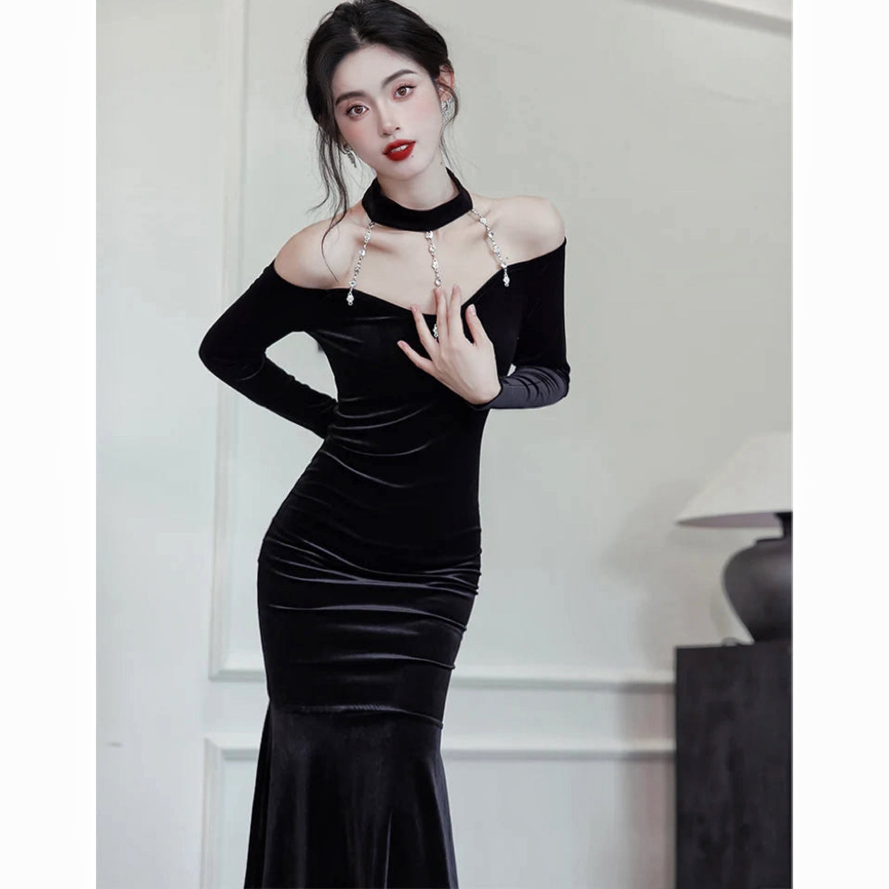 Presentamos nuestro Vestido de Terciopelo "Diosa en la Noche": la adición perfecta a tu armario de estética oscura. Este vestido irradia un aire misterioso y seductor con su estilo oscuro y su diseño femme fatale. Confeccionado en lujoso terciopelo elástico, es cómodo y a la vez increíblemente elegante. Presenta escote y espalda con hombros descubiertos adornados con cristales, mangas largas ajustadas y bajo sirena. Largo midi. ¡Atrévete y destaca con este atractivo vestido femme fatale de la boutique ZzKit!