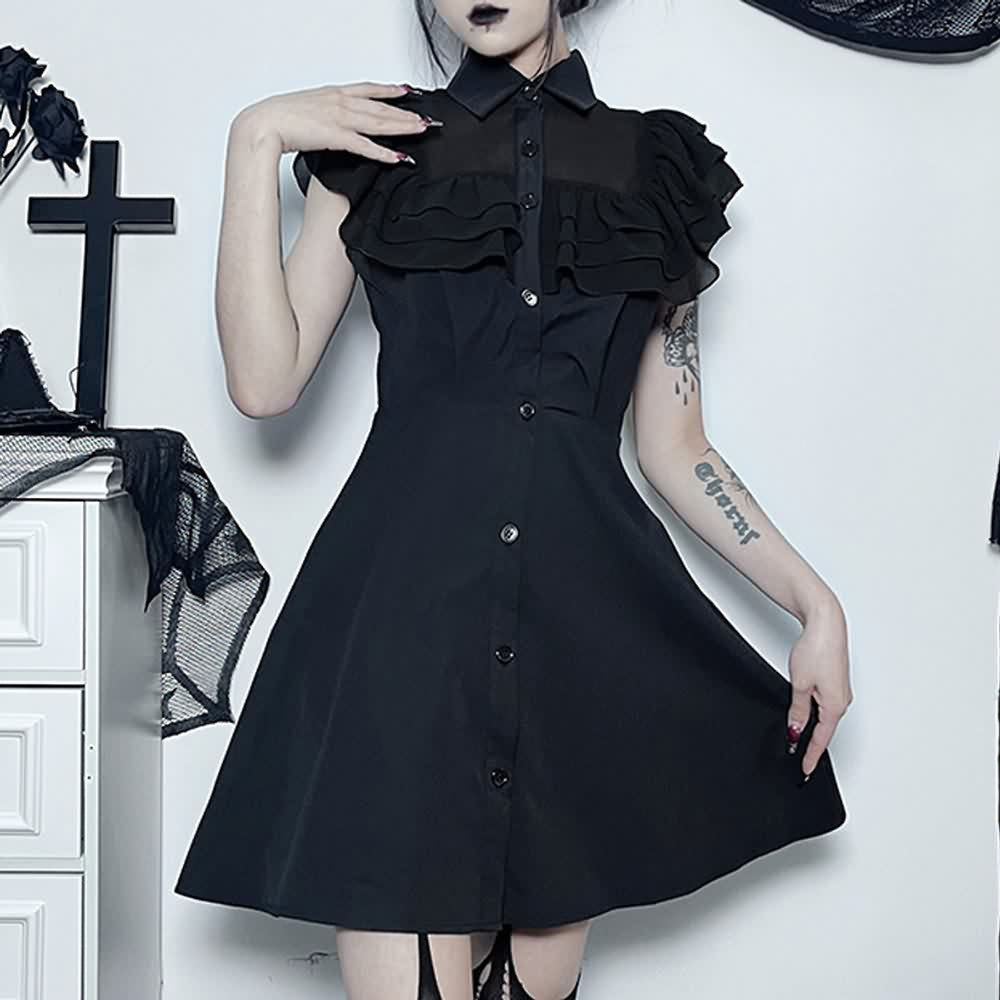 Descubre nuestro exquisito minivestido gótico oscuro Wednesday, inspirado en el icónico estilo de Wednesday Addams. Con un elegante cierre de botones y un elegante cuello, este vestido de corte A irradia confianza y sofisticación. Los delicados volantes añaden un toque de feminidad al atemporal tono negro gótico. Ideal para destacar en cualquier evento gracias a su largo por encima de la rodilla.