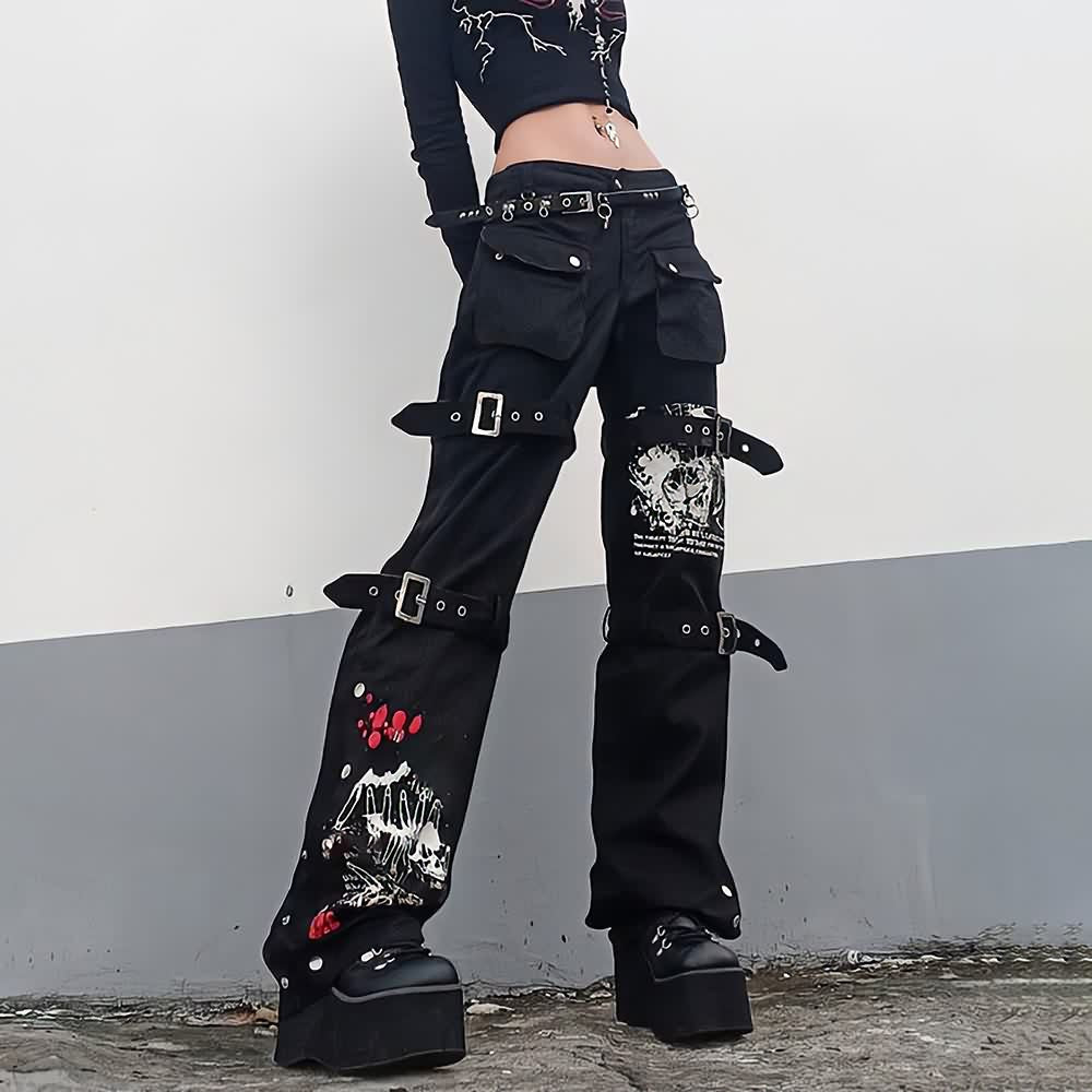 Descubre la combinación perfecta de comodidad y estilo con nuestros jeans cargo negros Emo Goth. Confeccionados en denim de alta calidad, estos jeans rectos lucen tirantes decorativos y estampados artísticos únicos, dándole un toque atrevido a tu conjunto. Equipados con bolsillos funcionales, estos jeans son una prenda esencial para los amantes de la moda emo, gótica y punk. Marca la diferencia con esta prenda destacada.