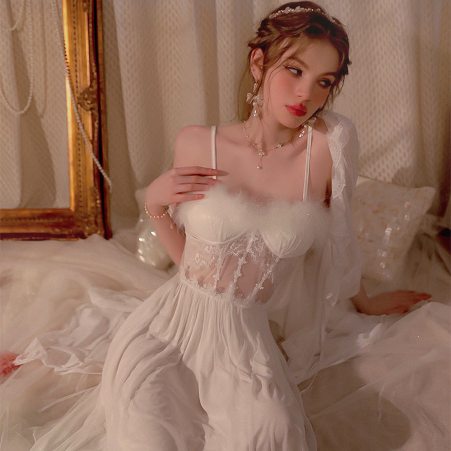 Conjunto de camisón de hadas de dos piezas que incluye vestido lencero con corpiño con plumas y relleno, y bata a juego con encaje. Este camisón está disponible con dos tipos de plumas: delicadas plumas de marabú o llamativas plumas de avestruz.
