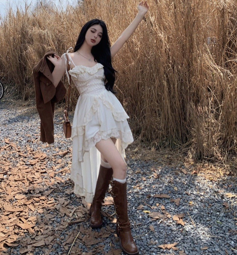 Minivestido de corte asimétrico con volantes, cintura acentuada y ribete de encaje. (No incluye chaqueta).