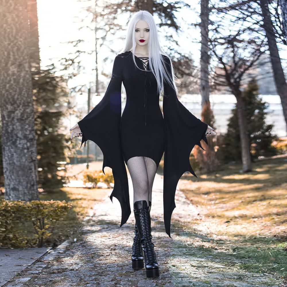 Descubre la elegancia oscura con nuestro minivestido gótico con mangas de murciélago. Este impactante atuendo luce mangas de murciélago y acampanadas, un seductor escote en V con cordones y un diseño ajustado que favorece la silueta. Confeccionado en una lujosa mezcla de poliéster y elastano, este vestido de estilo gótico es ideal para destacar en negro.