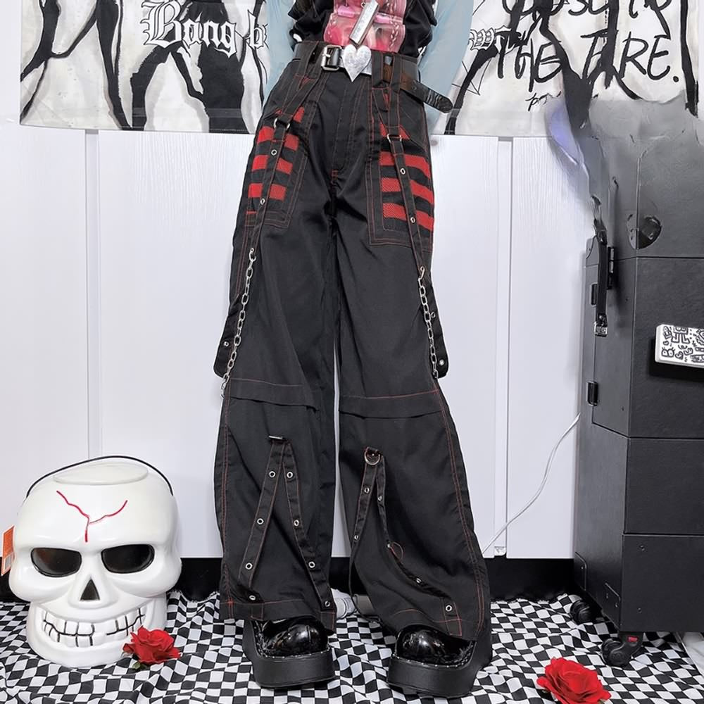 Consigue el estilo oscuro y vanguardista definitivo con los pantalones holgados Gothic Electro. Estos pantalones presentan un llamativo color negro con detalles en rojo sangre. Presentan ojales plateados y herrajes metálicos con anilla en D. Con profundos bolsillos de red y un cierre seguro, ofrecen funcionalidad y estilo. Perfectos para raves, conciertos o salidas informales. Estos pantalones garantizan un look moderno y seguro. ¡Dale rienda suelta a tu pasión por la moda oscura!