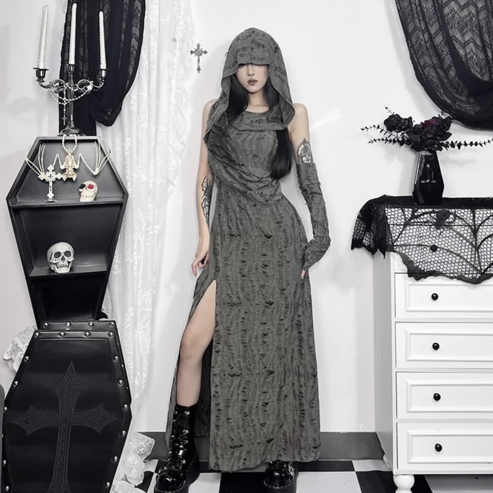 Descubre nuestro exclusivo vestido largo con capucha y abertura, con un toque de sofisticación vanguardista y desgastado de estilo gótico grunge. Con tejido gris desgastado, largo hasta los tobillos, abertura lateral y capucha, este vestido sin mangas irradia un encanto rebelde. Incluye un guante a juego para un toque de estilo. Realza tu estilo con esta exclusiva prenda que le dará un toque atrevido a tu armario.
