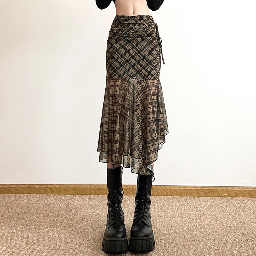 Explora el estilo de esta falda midi asimétrica de cuadros grunge góticos con un diseño único, cintura alta y detalles fruncidos. La sofisticación vanguardista del estampado a cuadros, combinada con un largo midi versátil y favorecedor, la convierte en una prenda impactante para despertar tu lado rebelde.
