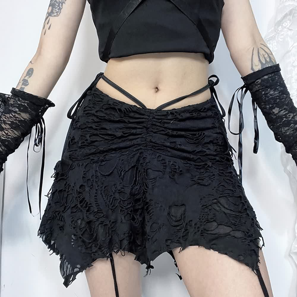 Realza tu estilo con nuestra minifalda gótica grunge con frunces y efecto desgastado. Los detalles fruncidos aportan textura y dimensión, mientras que los detalles desgastados le dan un toque rebelde. Completa tu look con el cordón y el dobladillo estilo pañuelo para un toque único. Disponible en elegante negro, esta falda por encima de la rodilla es perfecta para añadir un toque atrevido a cualquier look.