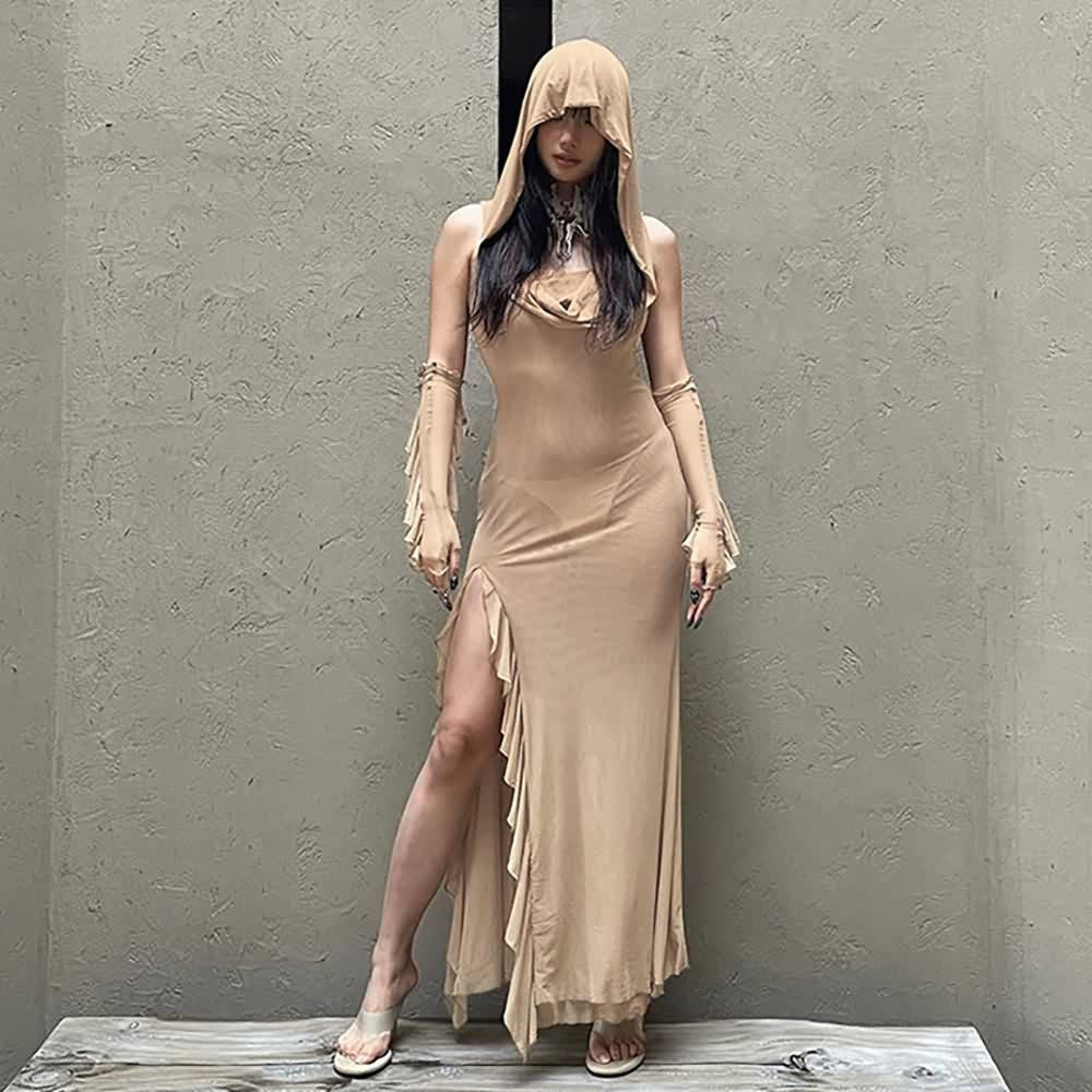 Saca a relucir tu lado gótico con nuestro vestido gótico de malla con capucha y abertura. Confeccionado en lujosa malla, este vestido está diseñado para cautivar y cautivar en cualquier evento elegante. Presenta una atrevida abertura en el muslo a un lado y un dramático volante en el bajo, que complementa a la perfección el impresionante color caqui. Este vestido sin mangas incluye guantes con volante, que le dan un toque refinado a tu conjunto. Luce con estilo y causa sensación en tu próxima ocasión especial.