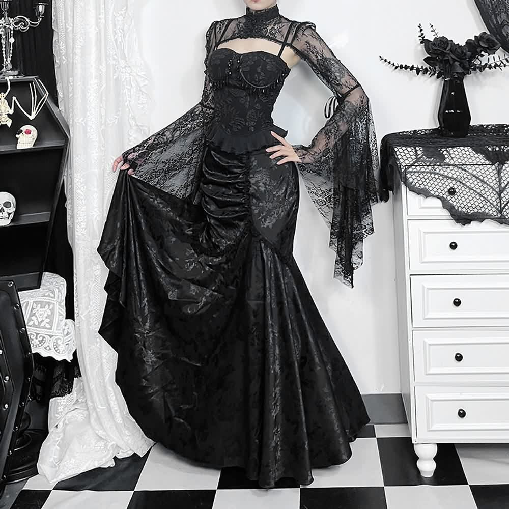 Realza tu estilo con nuestro conjunto de falda maxi y top corto gótico retro. Este elegante conjunto incluye un top corto con flecos y delicados tirantes finos, combinado con una impactante falda sirena con detalles fruncidos. El largo maxi y el elegante color negro irradian sofisticación, mientras que el sutil estampado floral le da un toque lujoso, lo que lo convierte en el conjunto perfecto para un look atrevido de inspiración gótica.