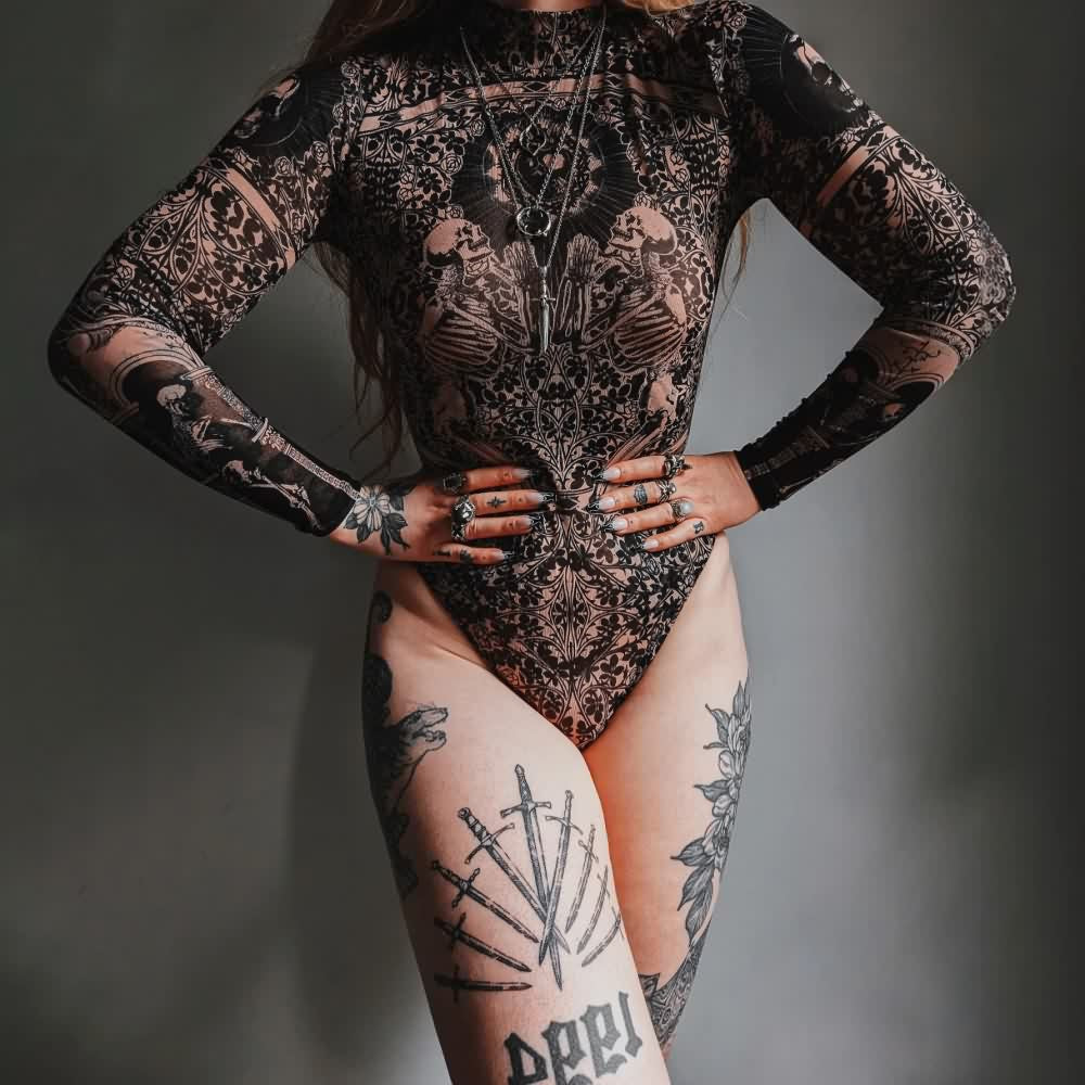 Descubre nuestro body gótico transparente de cuello alto y manga larga. Confeccionado en cómoda malla transparente. Este elegante body presenta mangas largas, escote alto para mayor cobertura y un llamativo estampado gótico beige de calaveras y esqueletos. Incluye broches en la entrepierna para facilitar su colocación. Esta prenda combina a la perfección comodidad y estilo.
