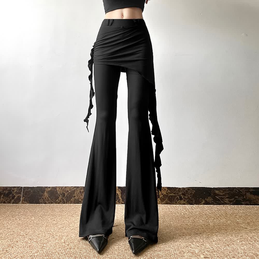 Realza tu estilo con nuestros pantalones acampanados con falda gótica superpuesta. Con una minifalda asimétrica superpuesta y un elegante diseño acampanado, estos pantalones de cintura alta ofrecen una combinación única de sofisticación y arte. Confeccionados en poliéster y elastano negros, ofrecen una estética elegante y alternativa. Perfectos para añadir un toque de elegancia audaz a tu armario.