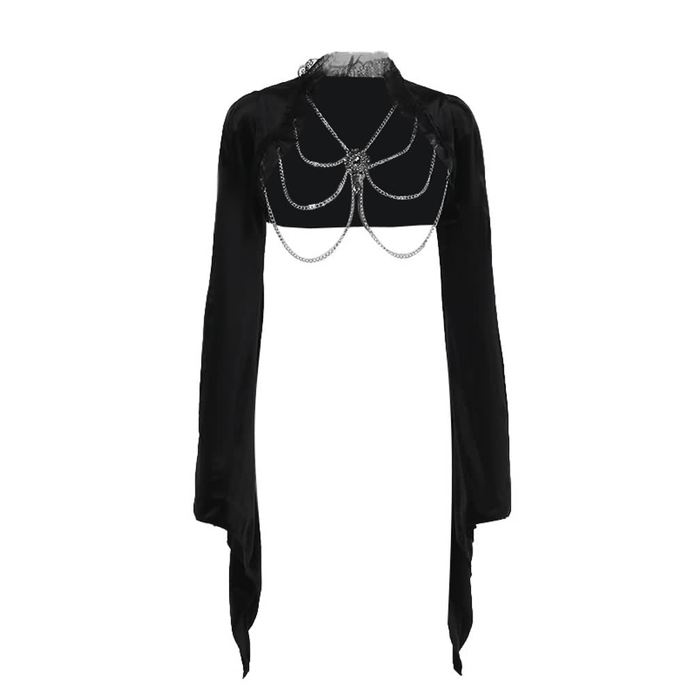 Disfrute del lujo con nuestro Top Gótico de Terciopelo con Cadena. Con delicados ribetes de encaje, mangas largas acampanadas y un llamativo detalle de cadena en forma de esqueleto. Esta exquisita pieza está confeccionada en terciopelo negro. Representa a la perfección la moda gótica y alternativa. Esta prenda ofrece un diseño único y exclusivo que realzará tu estilo.