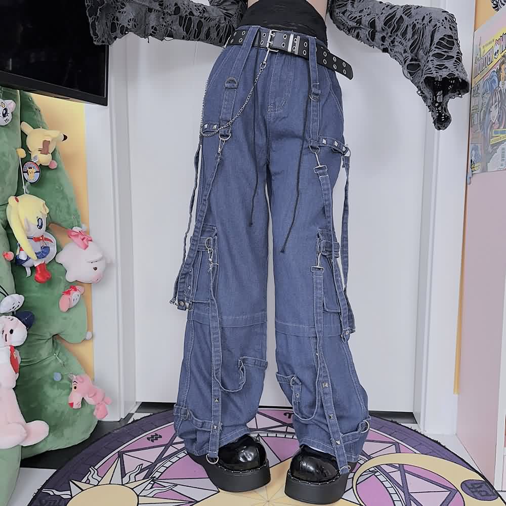 Mejora tu estilo con nuestros jeans cargo holgados con tirantes Grunge Goth. Confeccionados en denim azul de alta calidad, estos jeans combinan funcionalidad con un toque grunge. Con tirantes decorativos y una cintura alta favorecedora, ofrecen estilo y comodidad. Su corte holgado garantiza una silueta relajada y sofisticada, convirtiéndolos en una prenda versátil y llamativa para cualquier armario vanguardista. Renueva tu look y marca la diferencia con estos exclusivos jeans cargo.