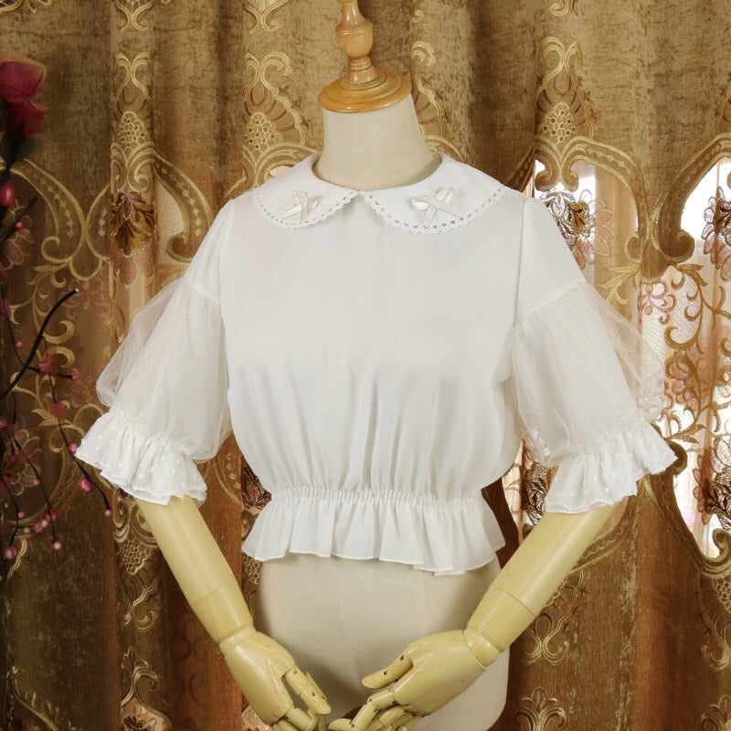 Blusa estilo princesa lolita kawaii con cuello Peter Pan. Lazo decorativo. Mangas cortas abullonadas con una delicada capa de tul.