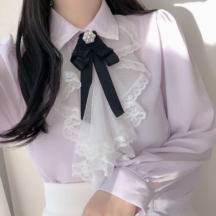 Camisa victoriana Light Academia con volante de tul y encaje. Cinta negra. Broche de flor y cuello con detalles de encaje.
