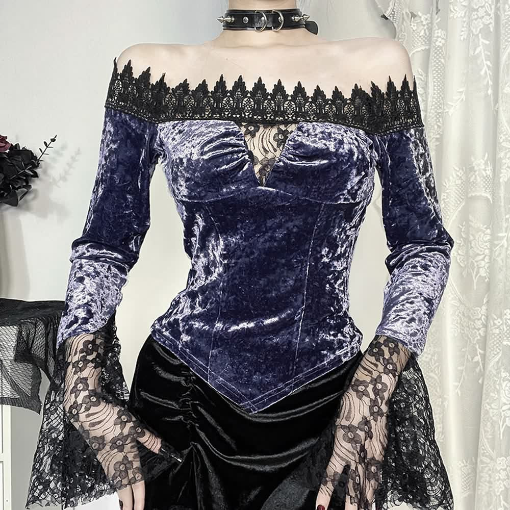 Disfrute de una lujosa elegancia con nuestro top de manga larga con hombros descubiertos de terciopelo gótico morado. Con un atractivo diseño de hombros descubiertos y mangas largas y sueltas acampanadas, este top encarna una estética alternativa. El intenso terciopelo morado, combinado con un ribete de encaje negro, crea un contraste impactante, mientras que el bajo asimétrico le da un toque de sofisticación. Perfecto para destacar en cualquier evento.
