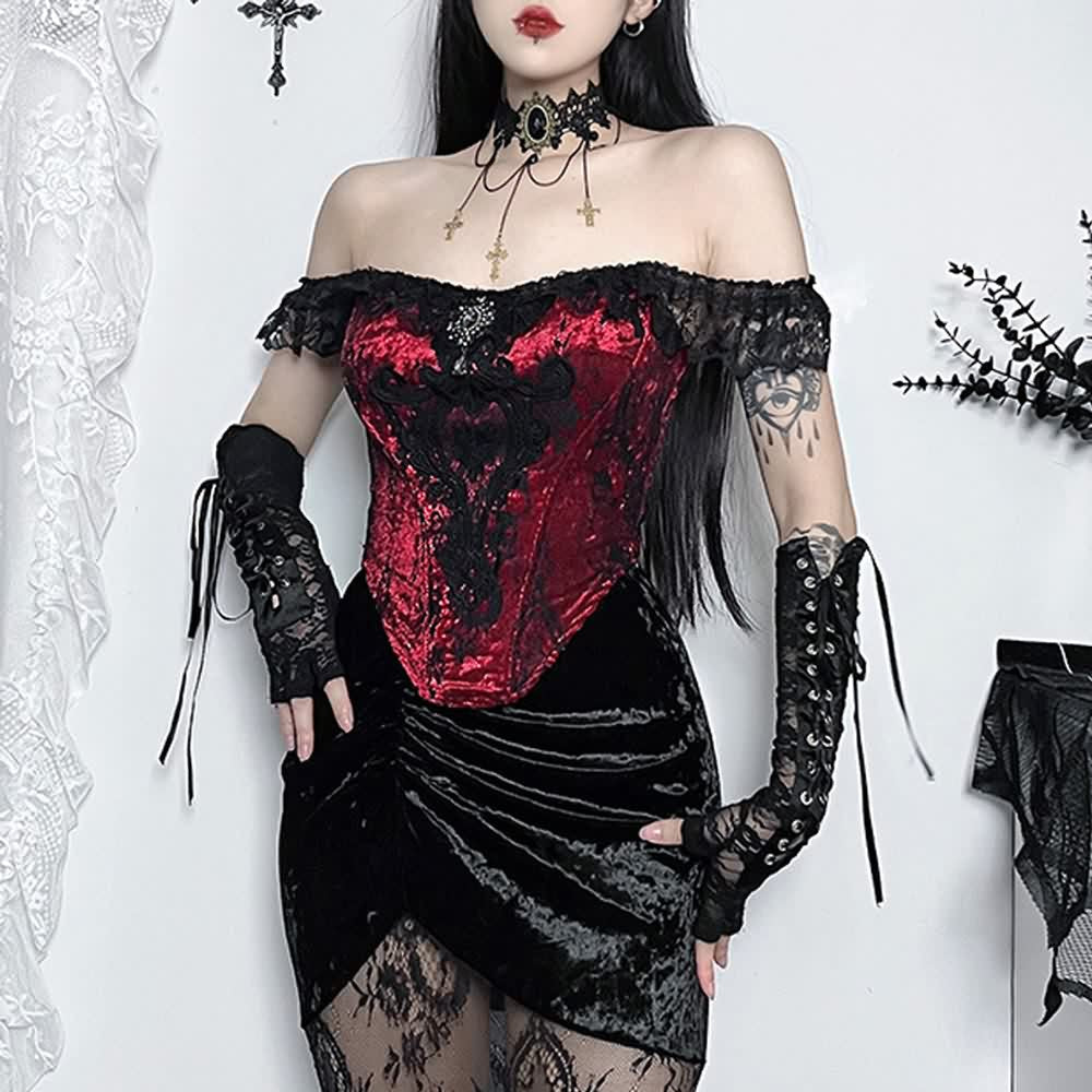 Realza tu estilo con nuestro top corto de terciopelo con encaje gótico victoriano rojo. Este top de terciopelo rojo con hombros descubiertos, detalles de encaje y un colgante de gemas ofrece un look sensual y lujoso. Su diseño tipo corsé le aporta opulencia. Ideal para quienes valoran la sofisticación y la elegancia.