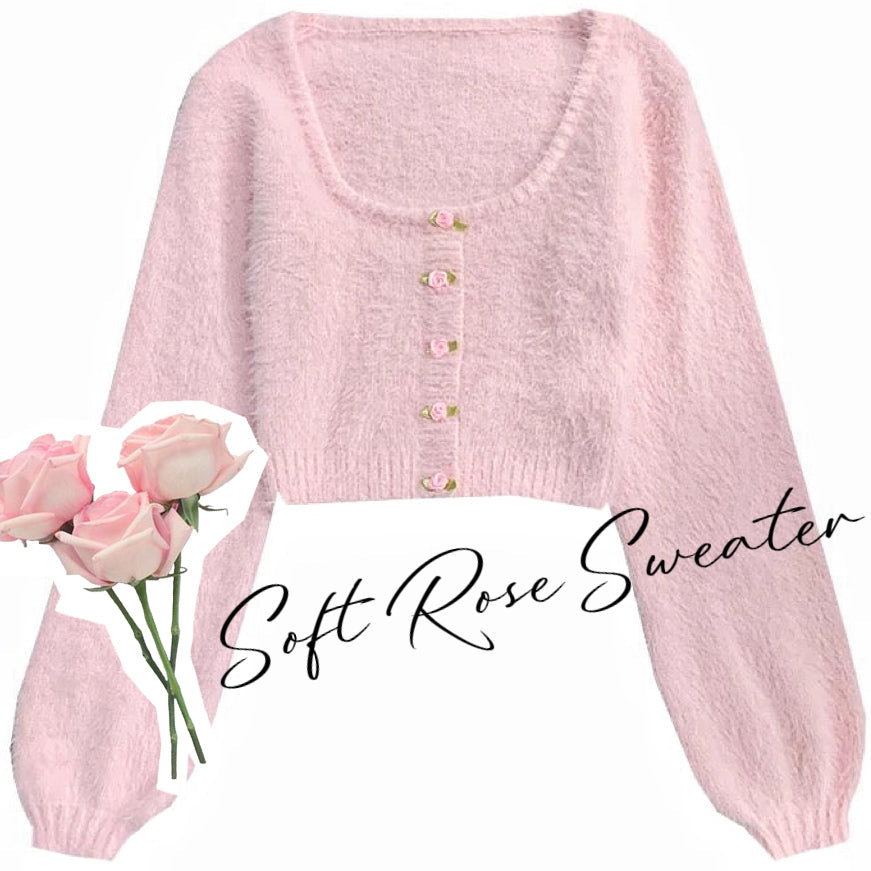 Suéter corto de mohair suave y afelpado en rosa bebé con escote ovalado. Mangas largas abullonadas y una bonita decoración de rosas en la parte delantera. Este bonito suéter tiene un ribete de imitación de cárdigan (las rosas no son botones, sino que están cosidas). Su confección elástica se adapta a las tallas S, M y L.