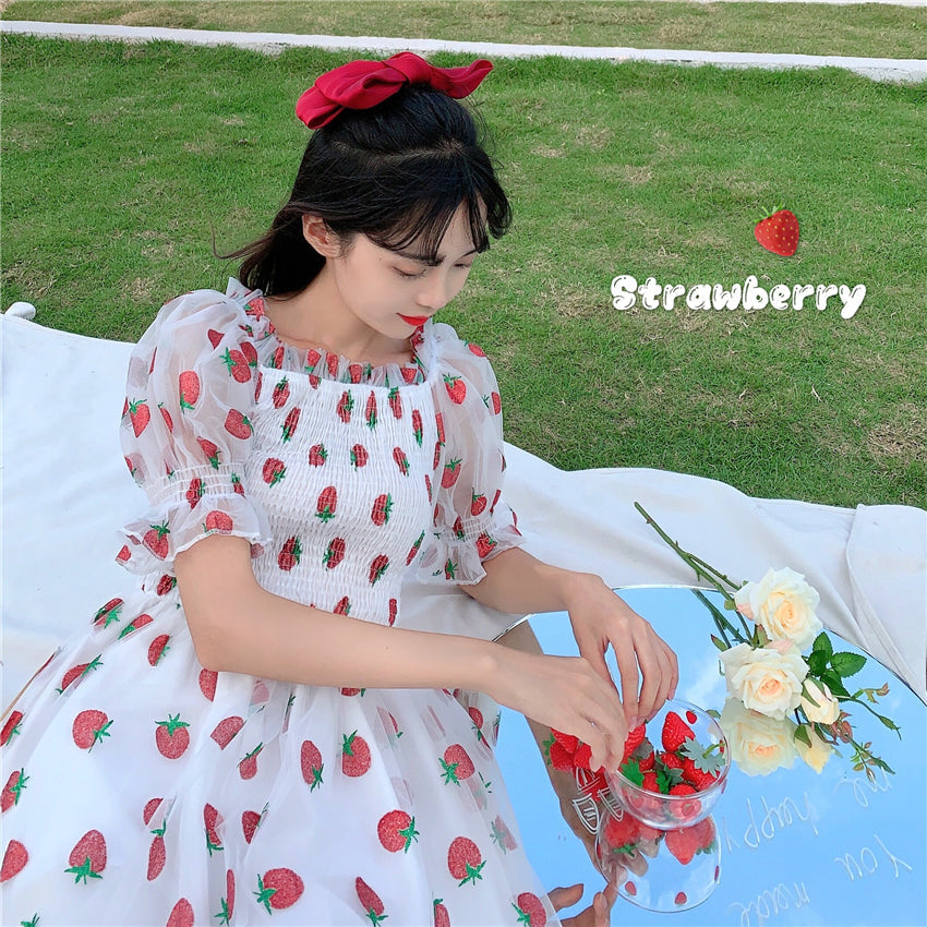 Vestido de hada de malla de tul con mangas abullonadas adornado con dulces fresas con corpiño elástico para adaptarse a tallas pequeñas, medianas y grandes.