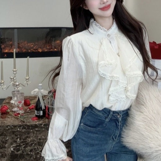 Camisa vintage victoriana ligera estilo academia con mangas acampanadas y volantes en la parte delantera.